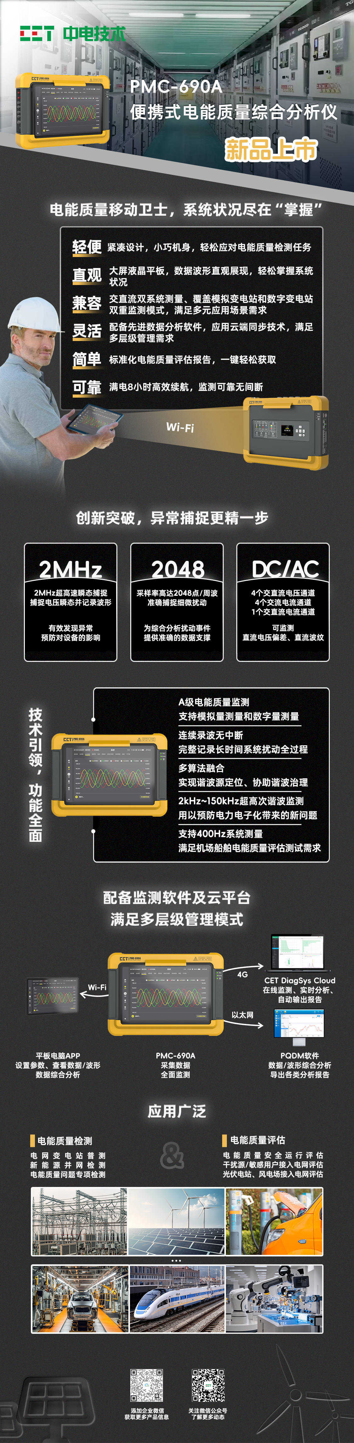 科技凝聚,便捷随行,新一代便携式电能质量综合分析仪PMC-690A新品发布!产品便携轻巧,使用简单高效,能够应对各类复杂工况和苛刻环境,为用户提供高效、精准的电能质量现场检测方案。