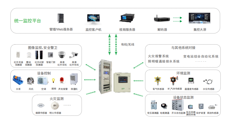 系统整合了辅助设备控制、视频监控、环境检测、安全防护、消防报警、门禁管理、配电开关状态监控及电量计量等数据信息,并上传至电网公司运检平台、物联网平台等,实现⼀体化、智能化集中监管,显著提高配电所运维效率,降低成本投入。
