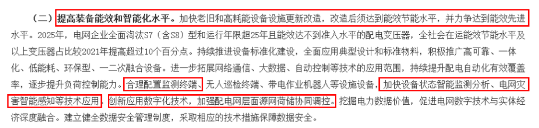 指导意见中提到“提高装备能效和智能化水平。加快老旧和高耗能设备设施更新改造,改造后须达到能效节能水平,并力争达到能效先进水平”“加快设备状态智能监测分析、电网灾害智能感知等技术应用”“创新应用数字化技术,加强配电网层面源网荷储协同调控”等多条建议。
