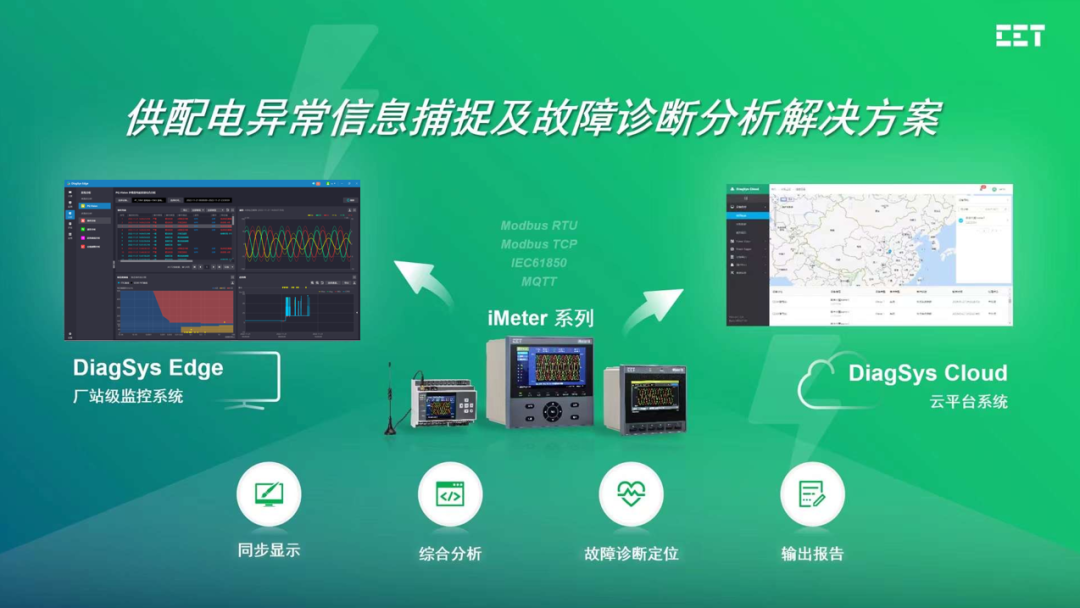 方案的设备层以iMeter系列供配电异常信息捕捉及故障诊断分析装置作为终端,满足A级电能质量监测标准,以GOOSE功能互联互通实现分布式、系统级故障录波。