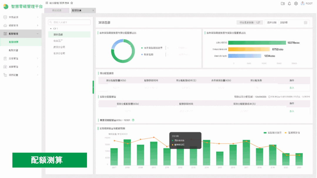 碳配额管理通过结合历史排放数据、行业基准测算碳排放配额。逐级分解碳配额,实现配额定量管理。预测未来碳排放量,提供配额盈缺预警,为企业碳减排及开展碳交易提供决策依据。