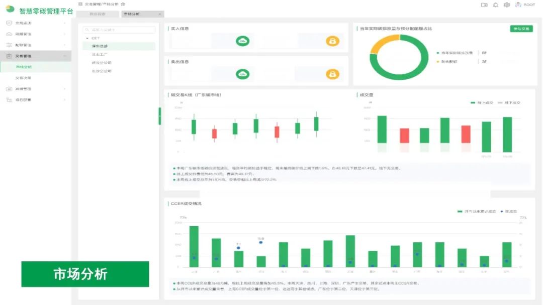 碳交易管理通过分析市场供需,形成周期性碳市场分析报告。结合碳市场分析及企业实际生产情况,依据实时碳价、市场行情,Al测算履约成本,指导交易决策,降低履约成本。