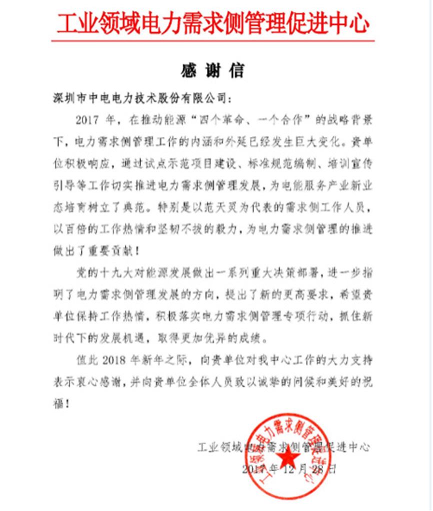 近日,CET深圳中电技术收到工业领域电力需求侧管理促进中心发来的感谢信,感谢我司通过试点示范项目建设、标准规范编制、培训宣传引导等工作切实推进电力需求侧管理发展,为电能服务产业新业态培育树立了典范。