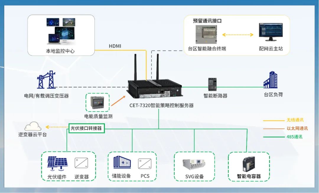 其中,方案搭载的CET-7320智能策略控制服务器内置多种控制策略,可自动根据电压越限值来调控逆变器无功功率输出,保证台区整体电压正常,并在CET-7320内集成CET自研的Psolution系统,既可直观就地展示电压实时调控效果,也可上传监控运维云平台。