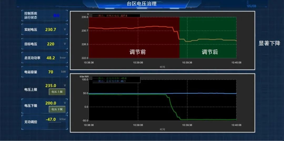 CET中电技术为其提供了CET农村台区电压治理解决方案,以并网点逆变器输出电压的电压偏差不超过标称电压的±5%为目标,通过智能电压控制策略优化调节逆变器等设备的无功功率输出,实现了分布式光伏电压的质量分析和自动集群优化调节,有效降低电压越限次数,提升电压指标合格率。