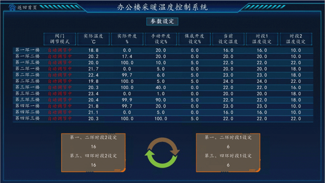 针对办公楼的实际情况,通过控制室内采暖温度的时间,使室内工作时间达到约 23℃(具体调整值根据用户需求为准)的合理工作,温度夜间及节假日无人时降低至18℃(具体降低值根据现场调节为准),通过节能改造调试找出最佳的方案,达到节约热能的目的。