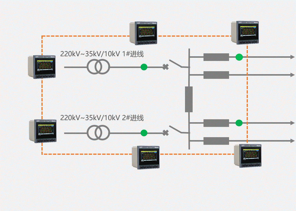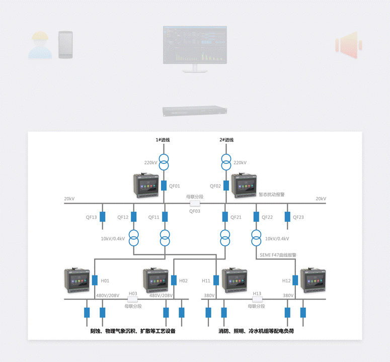 iMeter系列供配电异常信息捕捉及故障诊断分析装置分散安装在半导体用户供配电网的进线及关键节点,结合DiagSys异常信息捕捉及故障分析软件,对20μs级的用电异常信息进行捕捉与报警。