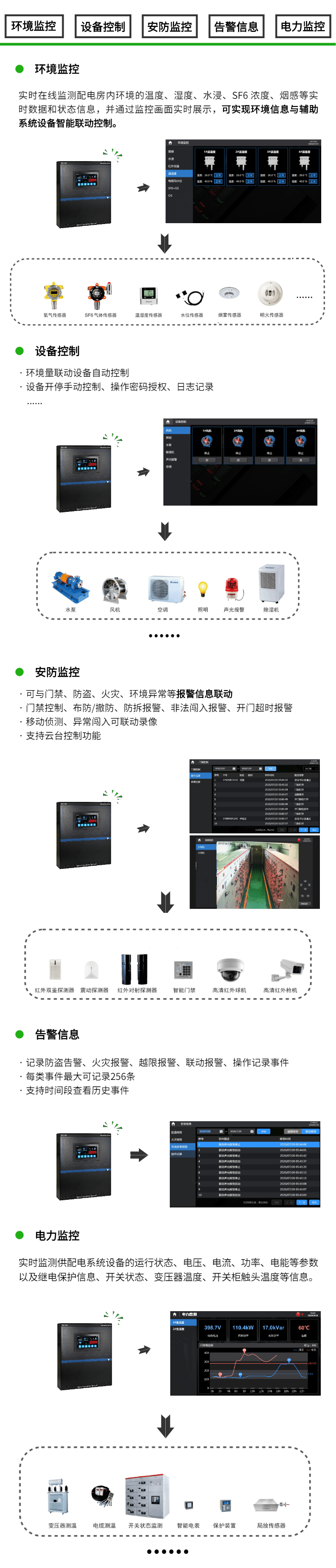 结合CET变电所智能综合监控系统,可完成对环境监控、设备控制、安防监控、告警信息、电力监控等信息的整合,并上传至统一监控平台。