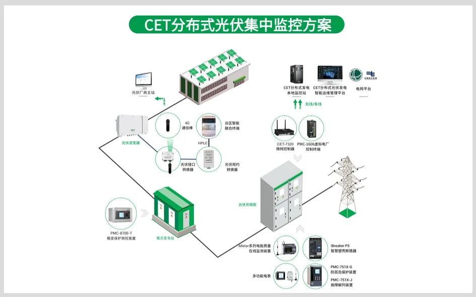 方案以安全、经济、高效、低碳为核心设计原则,将各项目市电供电、光伏发电、储能充放电、充电桩运行、负荷用电、以及光伏电站运行节能减排等信息进行集中采集和分析,实现信息化、自动化、智能化的智慧能源服务。通过可视化在线监测、智能数据分析等技术,实现对光伏电站的无人巡检、智能图像识别、光伏发电智慧分析,助力电站提质增效,确保电站安全、可靠运行。PMC-1606虚拟电厂控制终端具备接收和执行电力调度机构控制和调节指令的能力,满足电网运行“可观、可测、可调、可控”要求,具备微电网自治能力,可用于防逆流及功率因数治理等场景。故障解列、防孤岛、电能质量监测作为光伏并网的“三剑客”,可有效保护电网安全稳定运行,如iRealay 60综合保护测控装置、iRealay-51-G防孤岛保护装置的逆功率保护功能可用于大型工商业光伏、储能电站的防逆流场景。