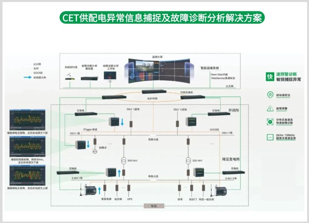 系统由iMeter系列供配电异常信息捕捉及故障诊断分析装置、CET DiagSys供配电系统故障诊断与分析软件组成。满足IEC 61000-4-30 Ed.3.1(2021)A级算法认证,具备20μs高速捕捉、大容量存储等特点,记录稳态、暂态、瞬态扰动全部信息。