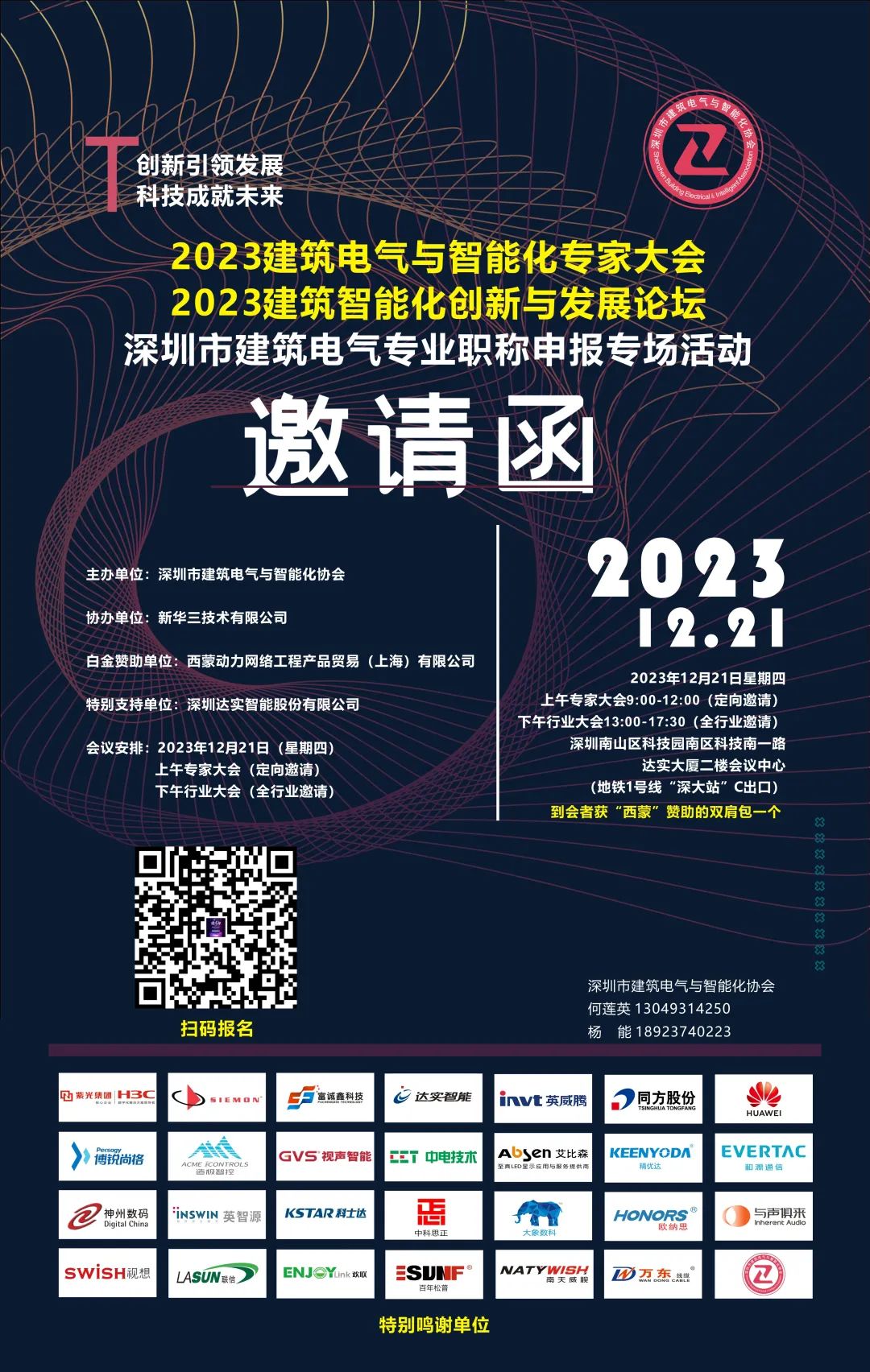 12月21日,2023年建筑电气与智能化专家大会暨2023建筑智能化创新与发展论坛将在深圳市召开,论坛将邀请深圳地区的建设、设计、集成、施工等工程设计公司代表参加,促进行业交流与合作。