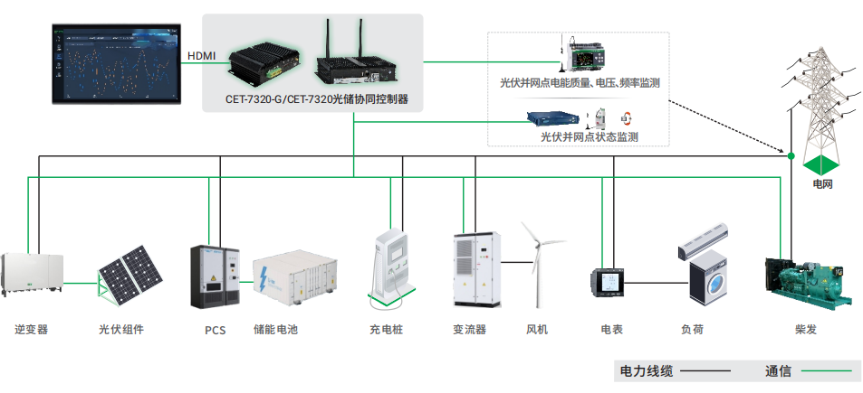 随着双碳目标的推进以及新型电力系统的构建,由光伏、储能、充电桩、用电负荷等组成的微电网系统得到越来越广泛的应用。CET-7320-G国产化光储协同控制器,专为分布式光伏发电功率调控以及多种微网控制策略需求而设计,可用于光储充系统的协调控制,提升绿电消纳率,保障客户的经济收益;还可在光储直柔场景充分发挥系统柔性作用,调控可调资源,保障系统安全、稳定、经济、高效运行。