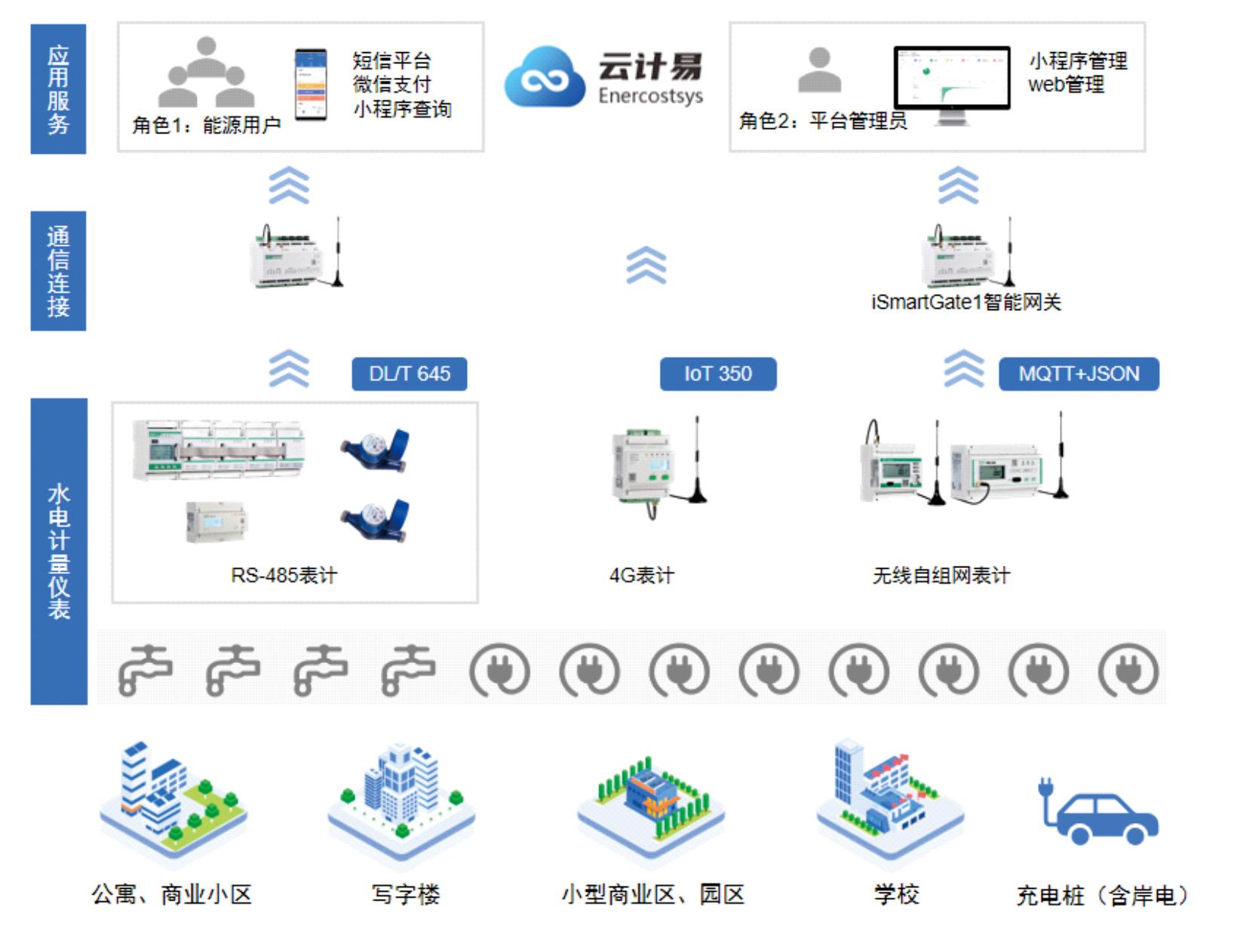 产品优势 线上交易:线上咨询与选型,明确客户需求后直接线上购买表计与云服务。 轻量成本:互联网+思维的业务模式,取代以往全套系统才能应用计费功能的传统系统集成模式,提供低成本的轻量化云服务 云端生态:为客户提供云服务生态账号,为客户提供统一、高效的账号管理服务。利用云端生态账号,可一号完成服务购买、计费管理,表计运维、服务升级等多项业务 移动管理:计费云服务采用小程序的形式,计费项目使用小程序进行管理,租户使用同一小程序进行在线充值缴费,充分发挥移动端的服务便捷性和高效性 智慧物联:使用移动手机终端,可随时随地查询和管控底层设备,打造智慧物联 设备高效接入:表计接入简单高效,轻轻一扫,即可为云端账号接入表计,关联对应房间 多种组网方式:设备可通过网关透传上传数据,也可采用4G通信方式上传至云端。设备运行稳定,支持多种通信协议 系统规模不受限:接入项目、设备不受数量、地域限制,一个账号可以管理多个项目,实现多终端远程协同办公 |