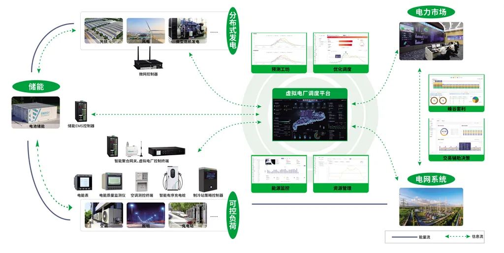 方案依托低时延强互动分布式资源通讯技术、分布式资源优化决策与协同控制技术、灵活的市场交易策略、云端协同的源网荷储管控平台等技术,助力用户打造虚拟电厂源网荷储智慧运行体系,促进分布式能源就近消纳,实现光伏、储能、空调等可调资源优化控制,调动用户侧调节响应能力,参与虚拟电厂市场交易。