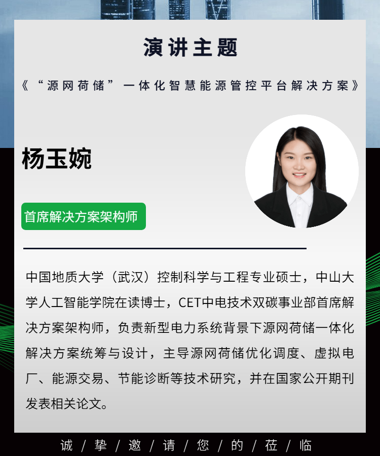CET中电技术参与本次年会,在建筑电气化创新交流会分论坛,CET首席解决方案架构师杨玉婉将发表题为《“源网荷储”一体化智慧能源管控平台解决方案》专题演讲,与参会嘉宾共同探讨源网荷储协同发展的创新路径,推动能源系统转型升级。
